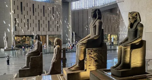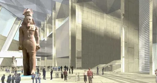 Zauzimajući ukupnu površinu od 490.000 kvadratnih metara u blizini visoravni Gize, u muzeju su smješteni najintrigantniji predmeti i artefakati, uključujući glavni ulaz od 7.000 kvadratnih metara sa kolosalnom statuom znamenitog faraona Ramzesa II. Muzej uključuje 6.000 kvadratnih metara “Grand Staircase”, koji se uzdiže na šest spratova, dvanest glavnih izložbenih sala koje se protežu na oko 18.000 kvadratnih metara i privremene izložbene prostore od oko 1.700 kvadratnih metara. Glavna galerija od 7.500 kvadratnih metara predstavlja najfascinantniji dio muzeja, koju siguran sam, neće zaobići ni jedan posjetitelj. Naravno, posvećena je blagu faraona Tutankamona, prikazujući po prvi put više od 5.000 jedinstvenih predmeta.