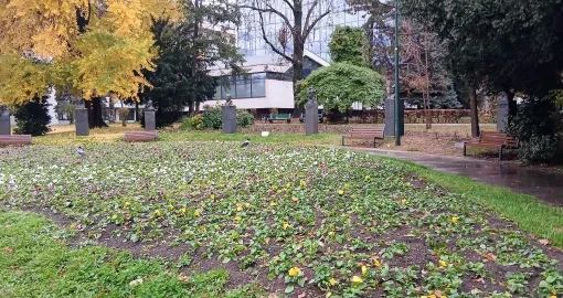 Konačno je ove jeseni zasađena cvjetna gredica u Malom parku, preko puta Predsjedništva BiH, u kojoj su raznobojne maćuhice već procvjetale, a prava urbana slika će to biti tek u proljeće.