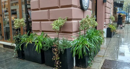 Vanjske bašte – kafane u Starom Gradu – uglavnom su sklonjene, ali na naše zadovoljstvo, ima vlasnika koji drže do zelenila, a prema tome i do ugođaja za posjetitelje i prolaznike, pa su za ovo doba godine primjereno zimzelenim biljem oplemenili žardinjere uz svoje objekte.