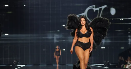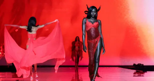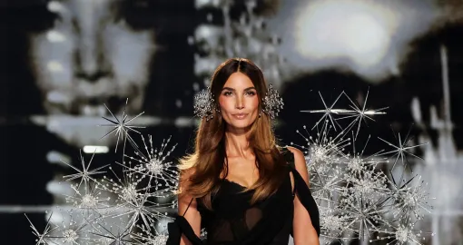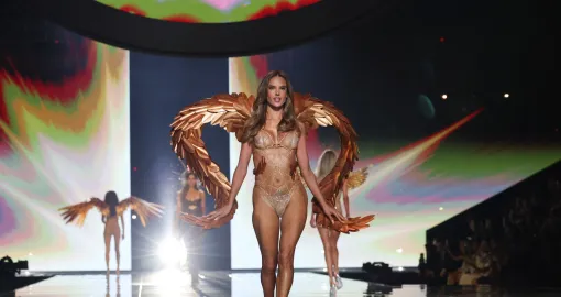 Revija je započela zadivljujućim trenutkom kada je Jasmine Tookes, u devetom mjesecu trudnoće, zakoračila na pistu. Blistala je u zlatnom mrežastom jednodijelnom kostimu ukrašenom krilima koja su svijetlila poput sijalica, pretvarajući pistu u pravu proslavu ženstvenosti, elegancije i samopouzdanja.
