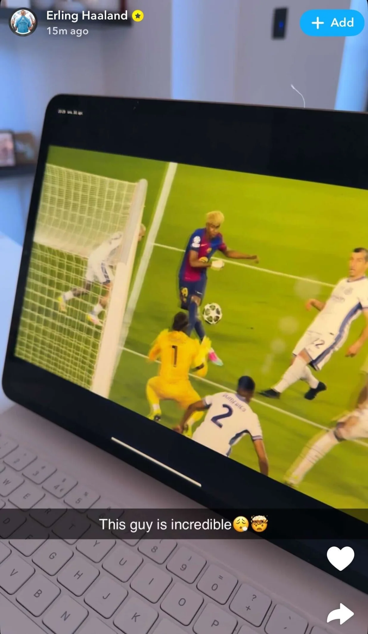 Norveški golgeter Erling Haaland, koji je utakmicu pratio iz svog doma, nije mogao sakriti oduševljenje, pa je na društvenim mrežama podijelio snimak Yamalove magije uz komentar: “Ovaj momak je nevjerovatan.”