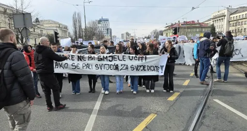 12:30 Okupljeni na protestu su krenuli u pravcu Marijin Dvora. Brojni učesnici protesta donijeli su transparente, među kojima se ističe jedna potresna poruka: "Majke ne bi smjele učiti kako se pali svijeća za svoje dijete!"
