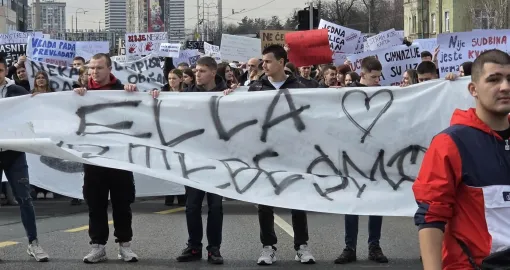 14:31 Okupljena omladina stigla je pred zgradu Predsjedništva Bosne i Hercegovine.