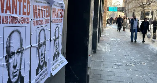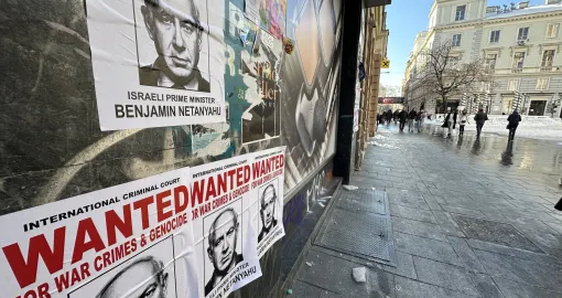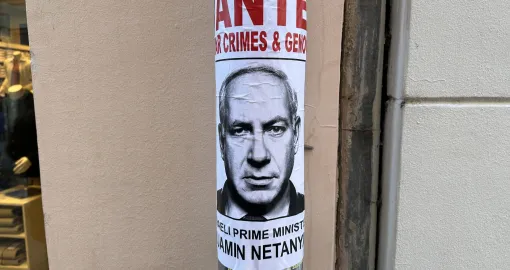 Na plakatima stoji portret Netanyahua uz natpis da je tražen zbog ratnih zločina i genocida po potjernici Međunarodnog krivičnog suda u Haagu.