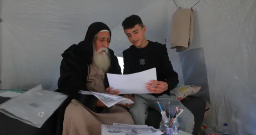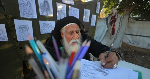 Okružen najlonskim zidovima šatora za raseljene osobe, 80-godišnji palestinski umjetnik Mohammed Abduljalil Zemlut crtanjem stvara umjetnička djela, prkoseći razaranju koje ga okružuje u Pojasu Gaze.
