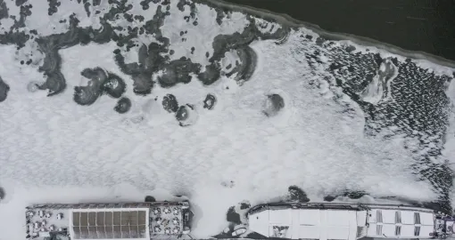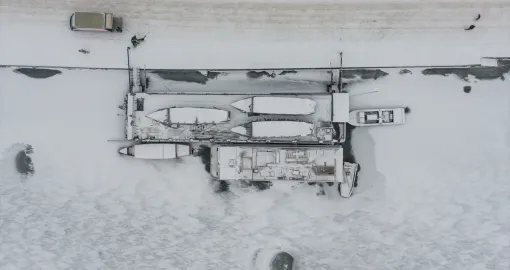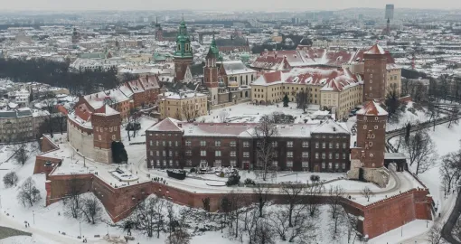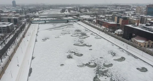 Snimci dronom agencije Anadolija prikazuju zabavne brodove okružene zaleđenim dijelovima rijeke Visle, zajedno sa snijegom prekrivenim područjima širom Krakova, dok se arktička zračna masa kreće dublje u centralnu Evropu.