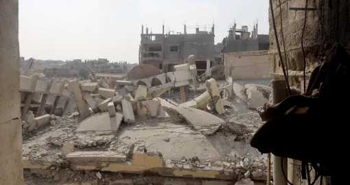 Džamija, gotovo potpuno razorena u udarima, sada služi kao privremeno sklonište porodicama koje među ruševinama pokušavaju preživjeti teške uslove i stalnu opasnost.