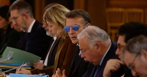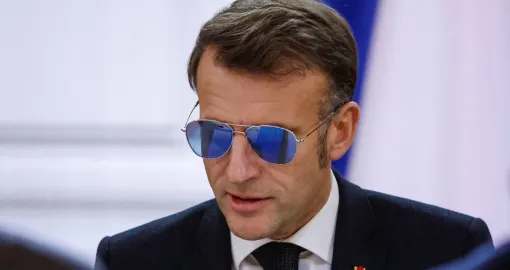 Predsjednik Francuske Emmanuel Macron pojavio se u petak sa plavičastim sunčanim naočalama na sastanku koji se održavao u Elizejskoj palači.