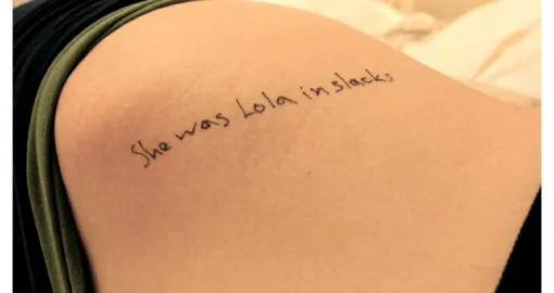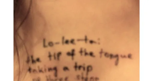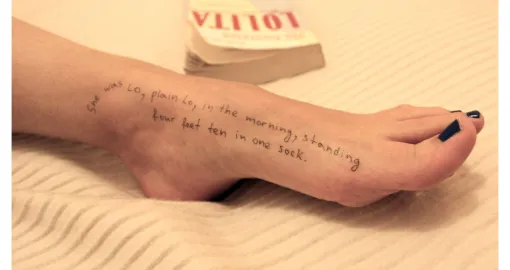 Jedna od fotografija prikazuje žensko stopalo na kojem je ispisan citat iz romana "Lolita" Vladimira Nabokova, djela o seksualnoj opsesiji muškarca dvanaestogodišnjom djevojčicom.